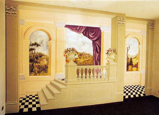 Le particolari decorazioni interni ottenute applicando l'antica tecnica del Trompe l'oeil ne implicano una sua piena padronanza. Occorre infatti avere assoluta conoscenza del disegno, delle tecniche prospettiche, di leggi specifiche, del corretto uso del colore e dello sfumato, per riuscire nell'intento di realizzare imitazioni credibili di una realtà altrimenti inesistente. Kiwi Art Studio può affidarsi, in questo, ad una tradizione artistica di oltre vent'anni, oltre che alla passione e l'impegno indispensabili per un continuo rinnovamento. I nostri dipinti murali impreziosiscono con maestria edifici pubblici e abitazioni private, con il preciso intento di abbellirli ampliandone gli orizzonti visivi. Eseguiamo piccoli interventi decorativi come anche più importanti lavori di rinascita.